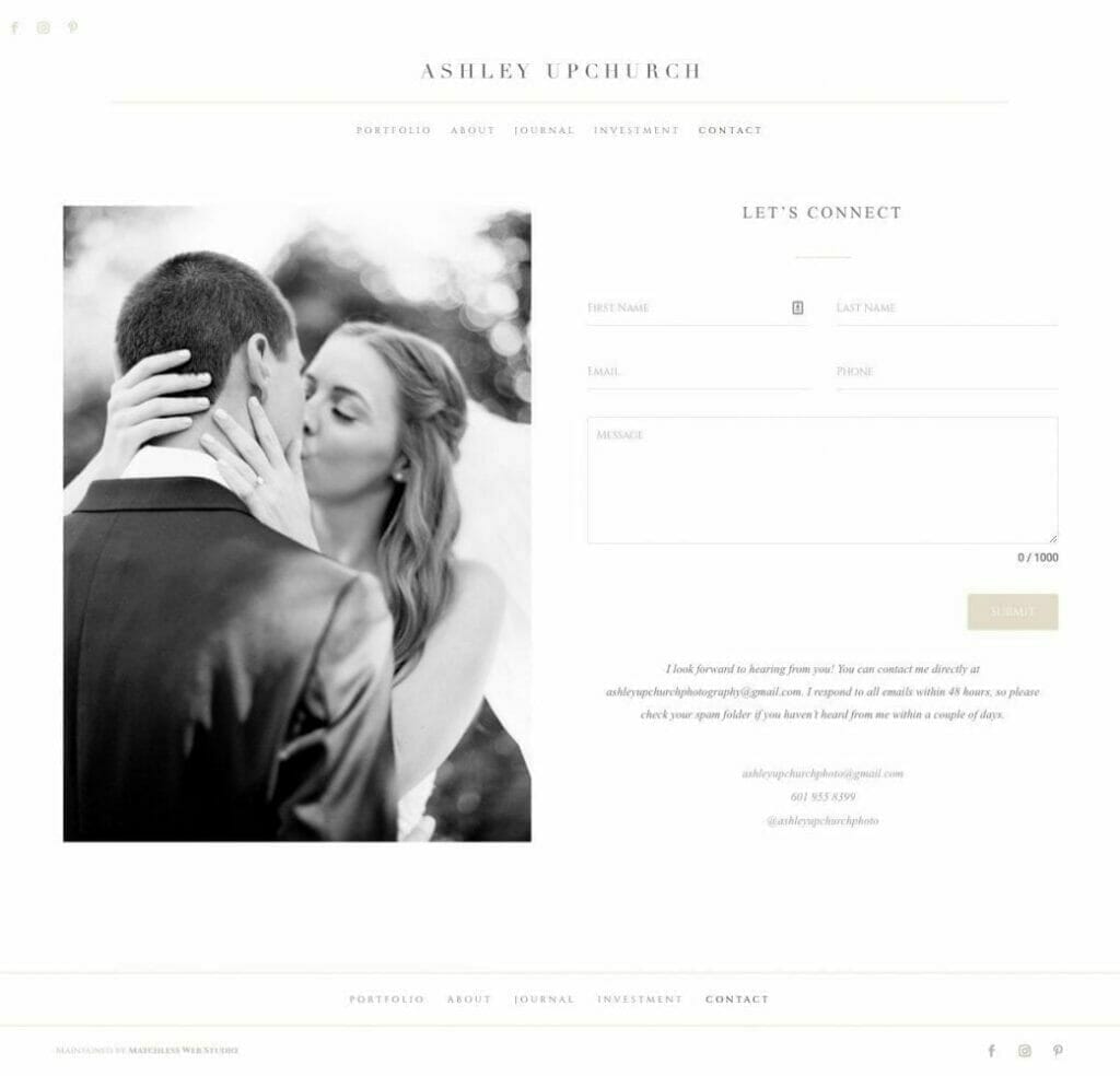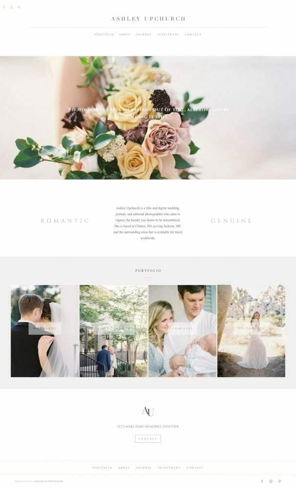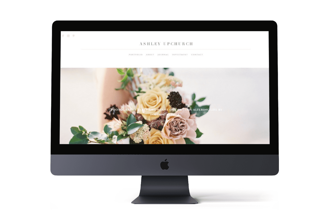 Now when Ashley wants to publish her work, she simply uploads her photos to a template and they display on the front-end in elegant fashion. Tasteful styling elements are spread throughout the site including beautiful font pairings, neutral colors, and plenty of white space.